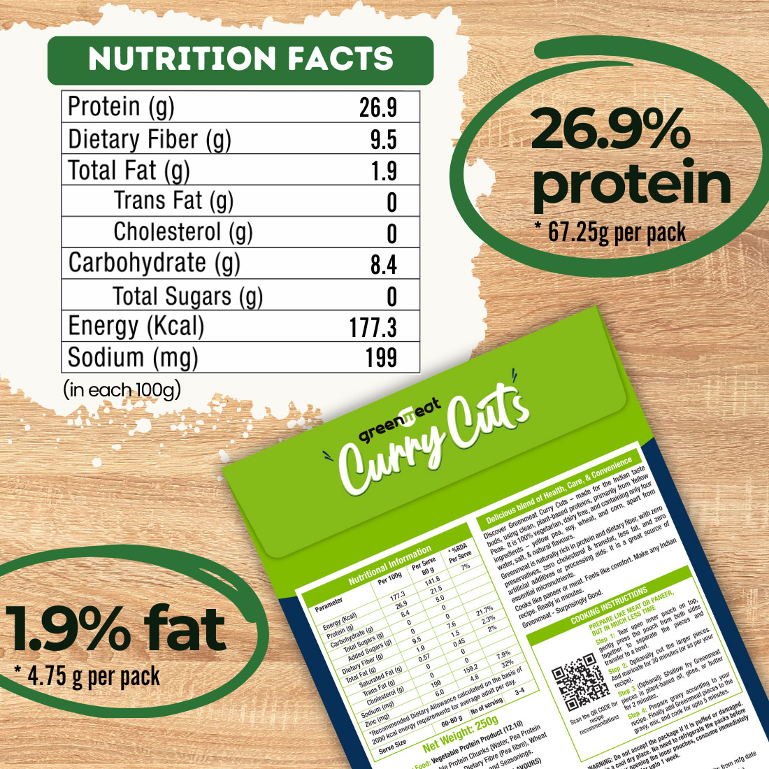 Discover the Greenmeat curry cuts that are freshly prepared for those who demand nutritious, versatile, and delicious plant-based options. Each 100g serving packs a powerful punch with 26.9g of protein and 9.5g of fibre, naturally supporting muscle health and digestion. Free from cholesterol, trans fats, and artificial preservatives, these wholesome vegetarian chunks perfectly complement any healthy lifestyle. Our vegan meat curry cuts are made conveniently and ready in minutes. Marinate them for 30 minutes and saute quickly, making them perfect for busy schedules. Greenmeat Curry Cuts deliver sustainable nutrition and bold taste, making it easy to enjoy a healthy, flavorful meal anytime.